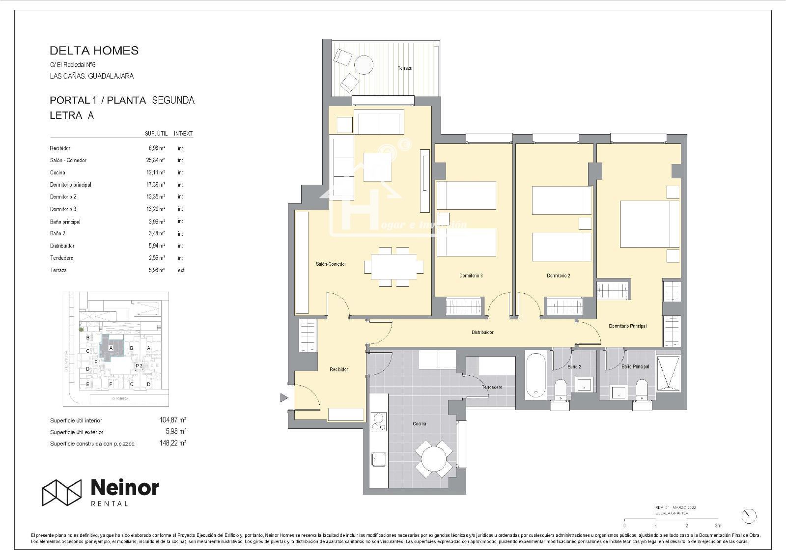 Consta de gran salón independiente de 26 m², cocina equipada totalmente con terraza tendedero, 3 dormitorios dobles, el principal con baño incorporado con ducha, el otro baño del piso tiene bañera y ambos tienen ventana. Tiene terraza a la que se accede desde el salón.